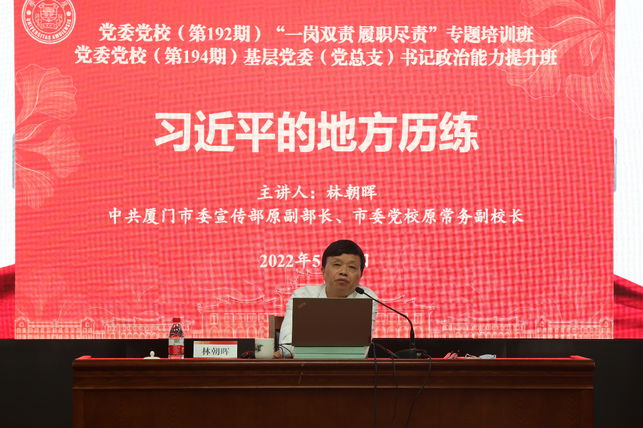 5月12日下午,学校举办(第192期)“一岗双责 履职尽责”专题培训班暨(第194期)基层党委(党总支)书记政治能力提升班专题报告,邀请中共厦门市委宣传部原副部长、厦门市委党校原常务副校长林朝晖讲述《习近平的地方历练》。校党委常务副书记林东伟主持报告会。