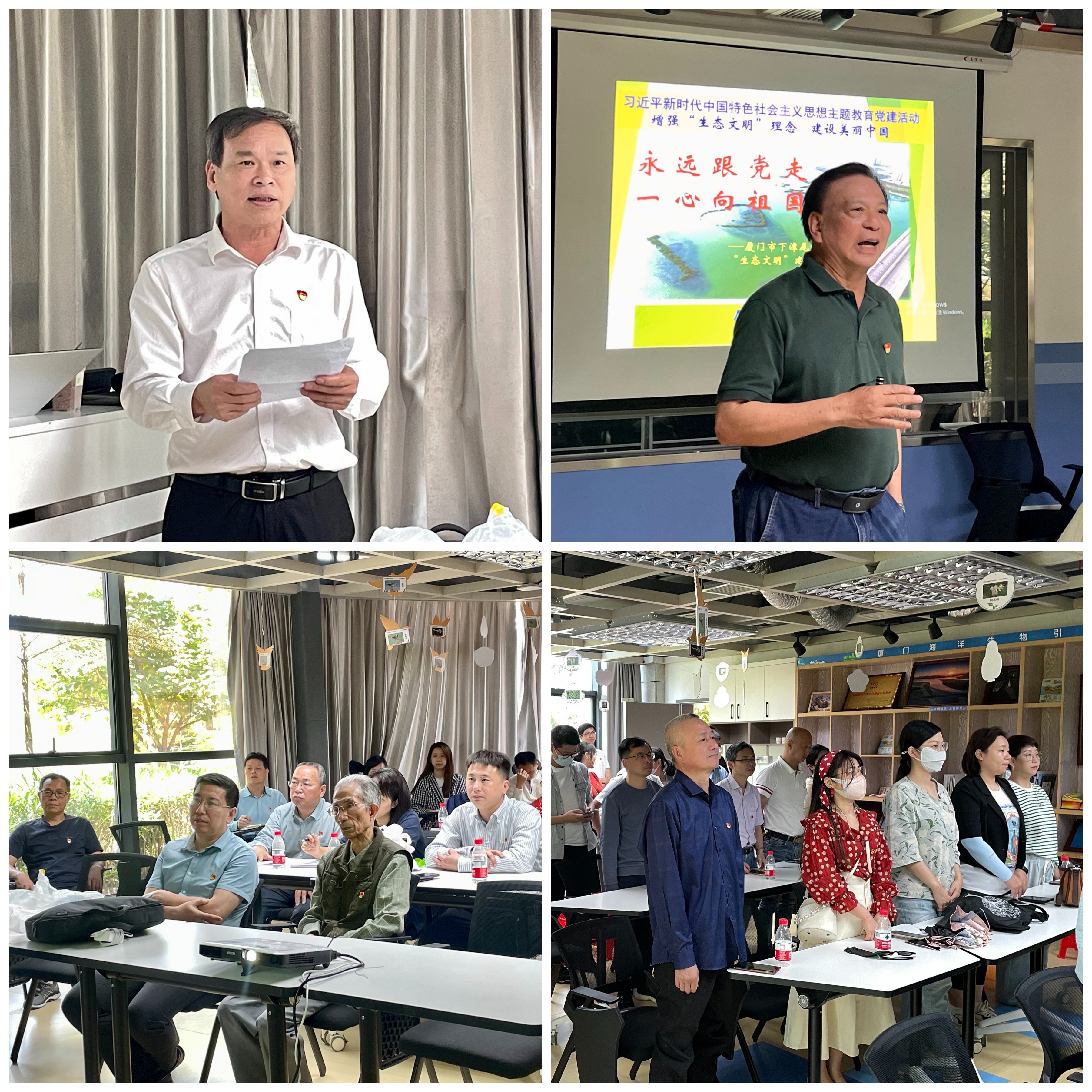 参观结束后,卢昌义教授为大家讲授了《永远跟党走,一心向祖国》主题党课,生动阐述了下潭尾红树林湿地景观建设和维护背后“鲜为人知”的故事以及海洋生态保护的重要意义。党课的最后,卢教授与全体党员一起高唱《没有共产党就没有新中国》,表达了对党、对祖国的热爱之情。